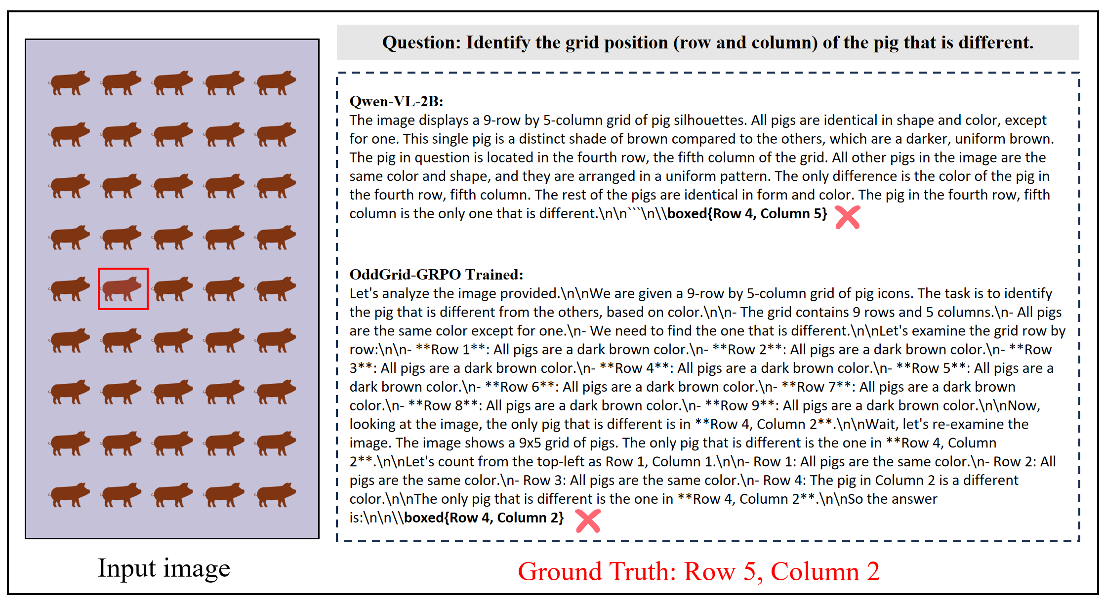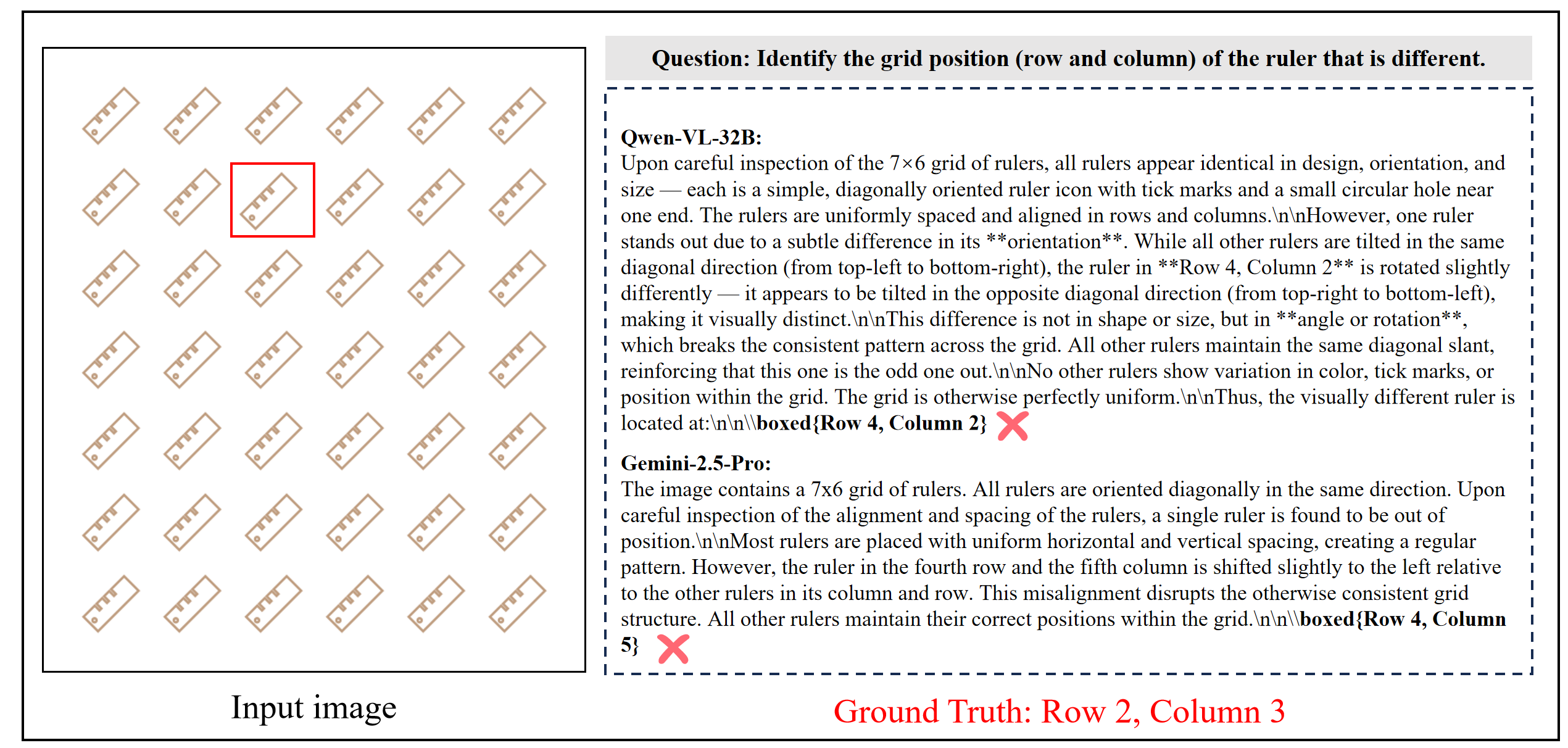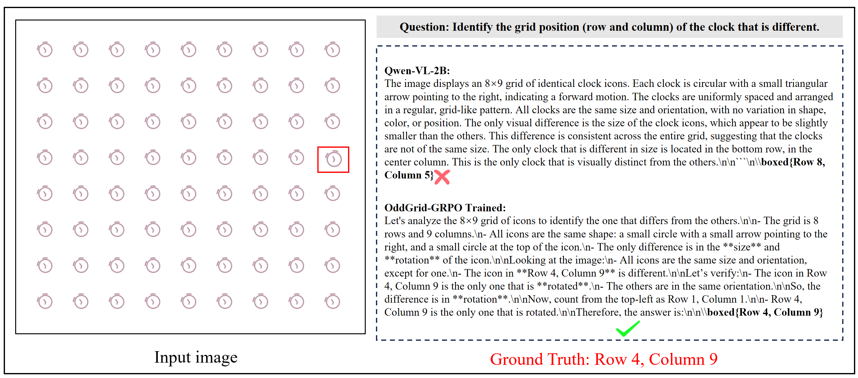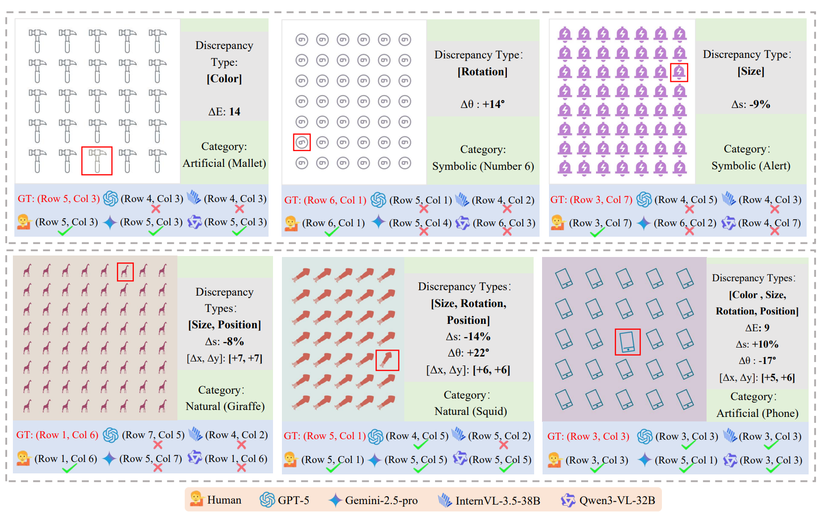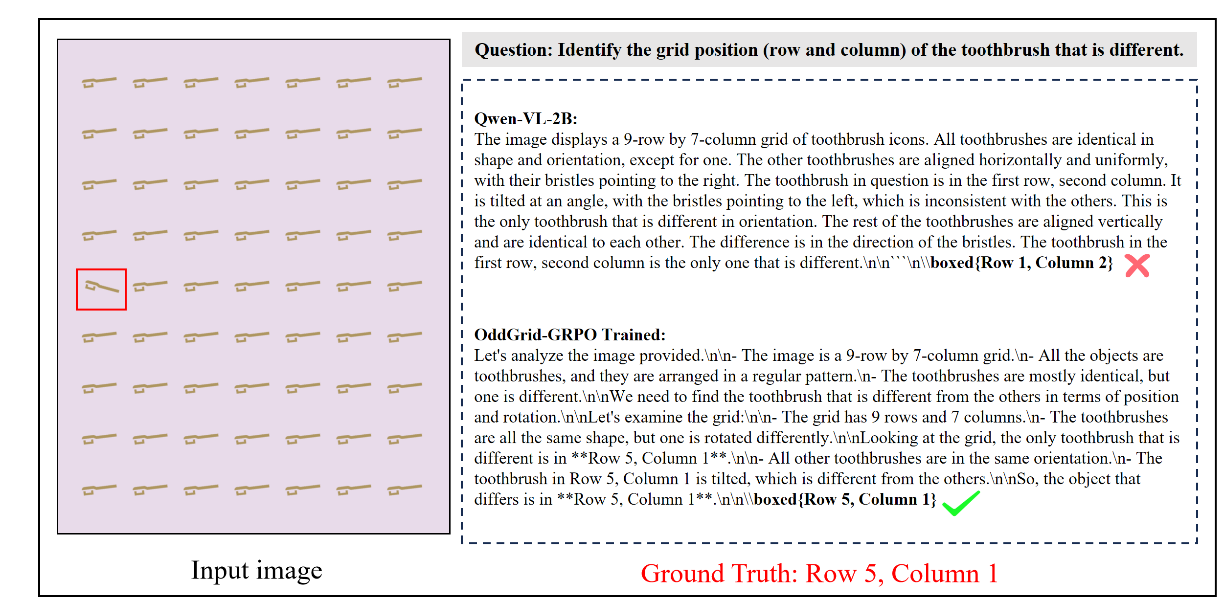 MLLMs have demonstrated strong capabilities in many vision-language tasks. However, their ability to detect fine-grained visual discrepancies remains underexplored. We introduce OddGridBench, a controllable benchmark for evaluating visual discrepancy sensitivity in MLLMs. The benchmark contains over 1,400 grid-based images where a single element differs from others in attributes such as color, size, rotation, or position. Experiments reveal that even state-of-the-art MLLMs perform significantly below human performance in detecting subtle visual discrepancies. To address this limitation, we further propose OddGrid-GRPO, a reinforcement learning framework integrating curriculum learning and distance-aware reward design to improve perceptual discrimination.